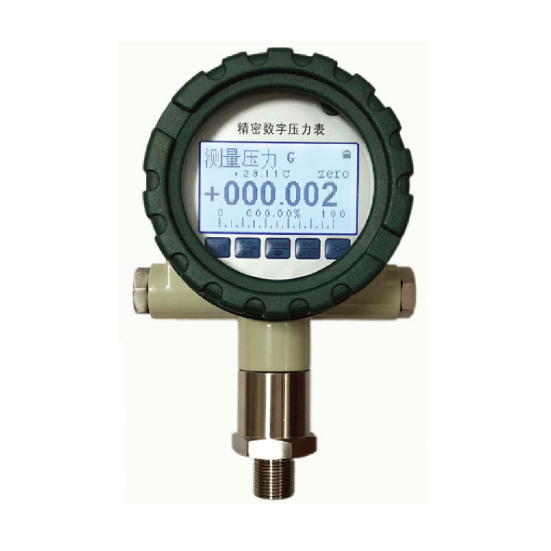 JC-YBS-100E精密数字压力表为户外安装型仪表,在测量压力的同时,可记录**值最小值并同时在显示屏上显示出来,显示压力的同时可显示压力百分比以及和压力百分比对应的棒状图形,显示直观通俗易懂。可选配和压力对应的4~20mA或1~5V输出功能,可选压力上下限设置继电器开关量输出功能。精密数字压力表除可作较高准确度校正标准器(表)外,也可作为现场校验仪表使用,广泛用于冶金、石油、化工、电力、天然气、计量及科研等部门。